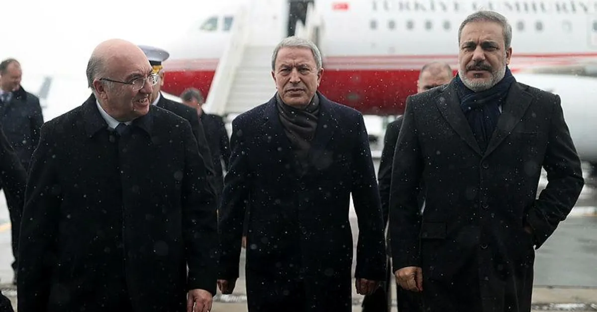 Milli Savunma Bakanı Hulusi Akar (ortada) ve Milli İstihbarat Teşkilatı (MİT) Başkanı Hakan Fidan (sağda), Türkiye'nin Moskova Büyükelçisi Mehmet Samsar (solda) tarafından karşılandı