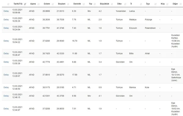AFAD SON DEPREMLER LİSTESİ