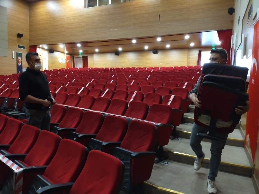 DÜZCE (İHA) – Düzce Belediyesi Kültür Merkezi Celil Yağız Sahnesi, korona virüs önlemleri kapsamında yenilendi. Salonun koltukları arasına koridor açılarak vatandaşlara kolaylık sağlandı. Düzce Belediyesi Kültür Merkezi’nin başta tiyatro olmak üzere panel toplantı ve konser gibi çeşitli kültür-sanat etkinliklerine ev sahipliği yapan Celil Yağız Sahnesi’nin koltuklarına yeni düzen getirildi. Pandemiden dolayı iptal olan salon etkinlikleri arasını fırsat bilen Düzce Belediyesi Kültür ve Sosyal İşler Müdürlüğü, meclis toplantılarının da yapıldığı salondaki koltuklar arasına yürüyüş koridoru açtı. Kültür ve Sosyal İşleri Müdürlüğü, salondaki yer ışık sistemi ve numaralandırmaları da yeniledi.