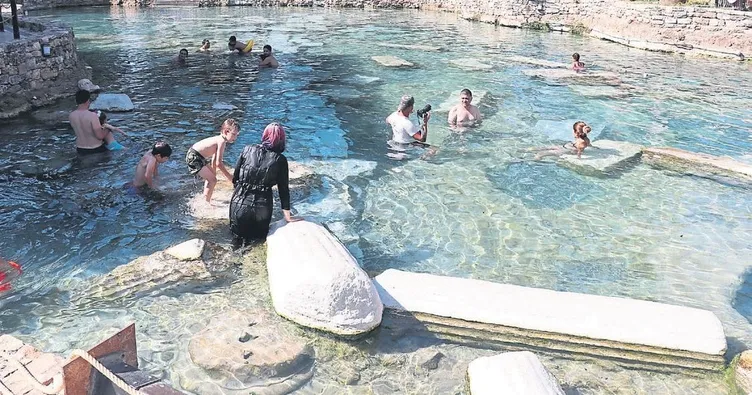 DENİZLİ'DE bulunan UNESCO Dünya Kültür Mirası Listesi'ndeki Pamukkale'de Hierapolis Antik Kenti'nde bulunan 2 bin 500 yıllık Antik Kleopatra Havuzu, ziyaretçilerin ilgisini çekiyor. Antik çağdan bu yana termal tedavi merkezi olarak bilinen Pamukkale'de, milattan sonra 692'de meydana gelen depremde, sütunların yıkılması ve termal suyun birikmesiyle doğal yollarla oluşan Hierapolis'deki antik havuz, dünyanın çeşitli ülkelerinden gelen turistler tarafından ziyaret ediliyor. Mısır kraliçesi Kleopatra'nın da yüzdüğüne inanılan tarihi havuzda, ziyaretçilere antik kalıntılar arasında yüzme olanağı sunuluyor.