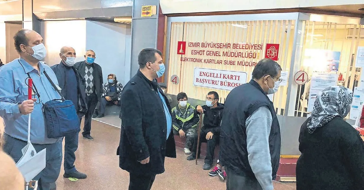 Türkiye Beyazev Derneği İzmir Şube Başkanı Salih Arıkan, geçtiğimiz günlerde engelli kartına HES kodu almak için İzmirimkart Müdürlüğü'ne gitti. İzmir Büyükşehir Belediyesi'ne bağlı merkeze mesai saati başlar başlamaz giden görme engelli Arıkan, yanına da refakatçi olması için arkadaşını aldı. Koronavirüs tedbirlerinin alınmadığı kalabalık bir ortamda tüm gün ayakta bekleyen Arıkan, kart müdürlüğünde çalışanlara engellilere öncelik olup olmadığını sordu. Aynı zamanda koronavirüs için riskli durumda bulunan şeker ve tansiyon hastası Arıkan, kimseye öncelik tanınmayacağını öğrenince akşam mesai bitimine kadar bekledi. Kart alma işleri yetişmeyen Arıkan, "Bu ayrımcılığın resmidir. Altı üstü engelli olduğum için engelli kartı almak istedim. Ama İzmir Büyükşehir Belediyesi her zaman ki gibi engellilere göstermelik bir şeyler yapmaktan ileri adım atamıyor" dedi. Salih Arıkan, "Engelli olmayan insanlar internetten bile kart başvurusu yapabilirken engelliysen raporunla birlikte buraya gelmek zorunda kalıyorsun. Bir engelli olarak bu yapılanlar bize eziyetten başka bir şey değil. Zaten koronavirüs önlemleri alınmamış büyük bir kalabalık grubu içinde saatlerce bekledim. Sırada kimler yoktu ki yaşlılar, engelliler ve diğerleri. Belediyenin böyle bir durumda farklı çözümler bulması gerekmez mi. En basiti sıra numarası alınır ve hangi numara yanıyorsa o arkadaş işlemini yaptırır. İzmir Büyükşehir Belediyesi bu kadar mı iş bilmez. Bu apaçık ayrımcı bir uygulamadır. Engellilerde internet üzerinden kart başvurusu yapabilir. Dışarı çıkamayan engelli başvuru sahipleri bile buraya gelmeye zorlanıyor. Bizler engelliyiz. Engellilerin her zaman önceliği var. Ama çalışan arkadaşlarımız bunu bilmiyor bile. Engelliler yaşlılar ve halkın sıraya geçerek beklemesi kabul edilebilir değil lütfen farklı çözümler üretilsin gerekirse süre uzatılsın" diye konuştu.