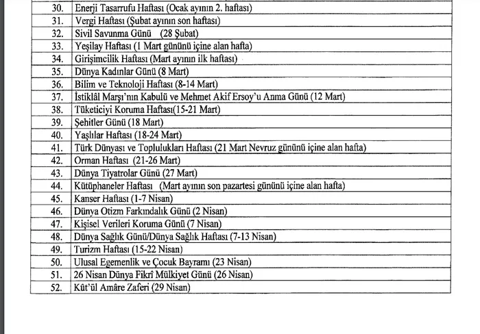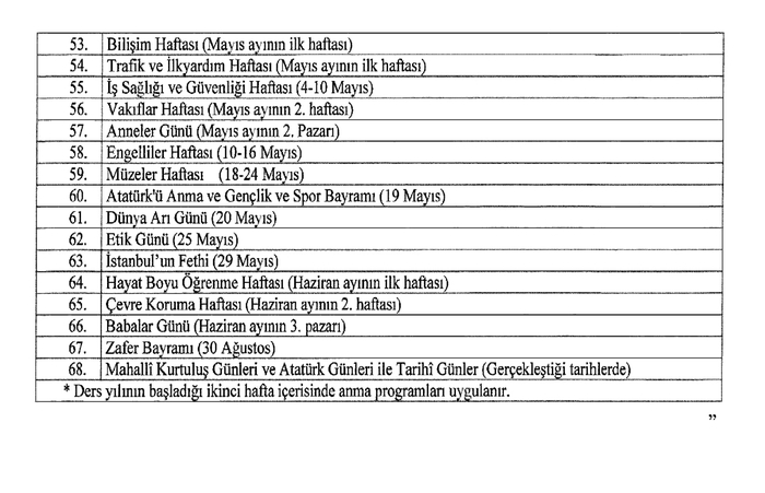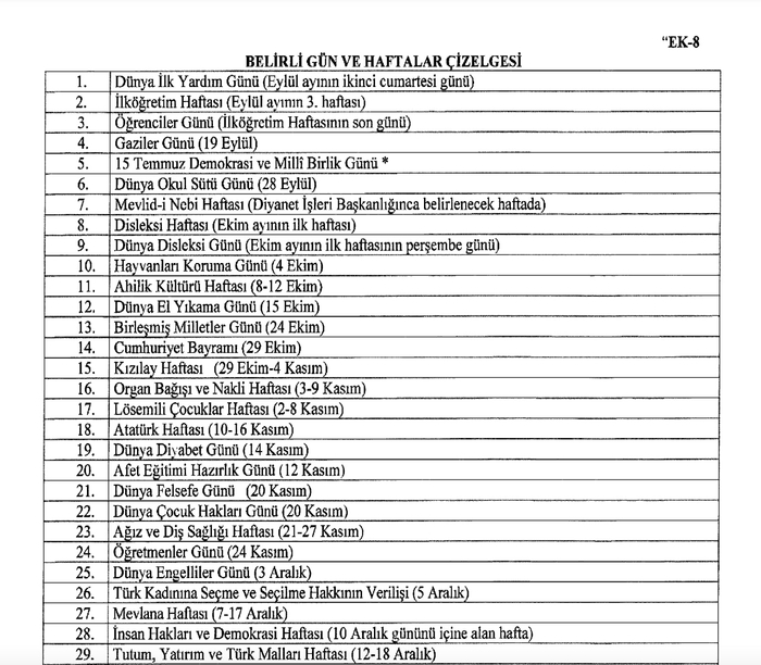 Millî Eğitim Bakanlığı Eğitim Kurumları Sosyal Etkinlikler Yönetmeliğinde Değişiklik Yapılmasına Dair Yönetmelikle Belirli gün ve haftalar çizelgesi güncellendi. Güncellemenin ardından Belirli gün ve haftalar çizelgesi MEB tarafından yayınlandı. Gaziler Günü, Öğrenciler Günü, 15 Temmuz Demokrasi ve Milli Birlik Günü gibi birçok önemli gün ve hafta çizelgede yer alıyor.
