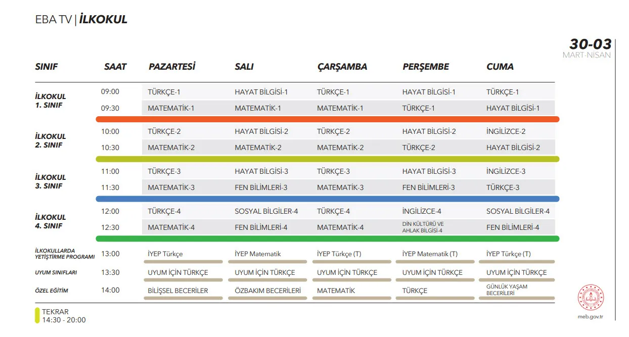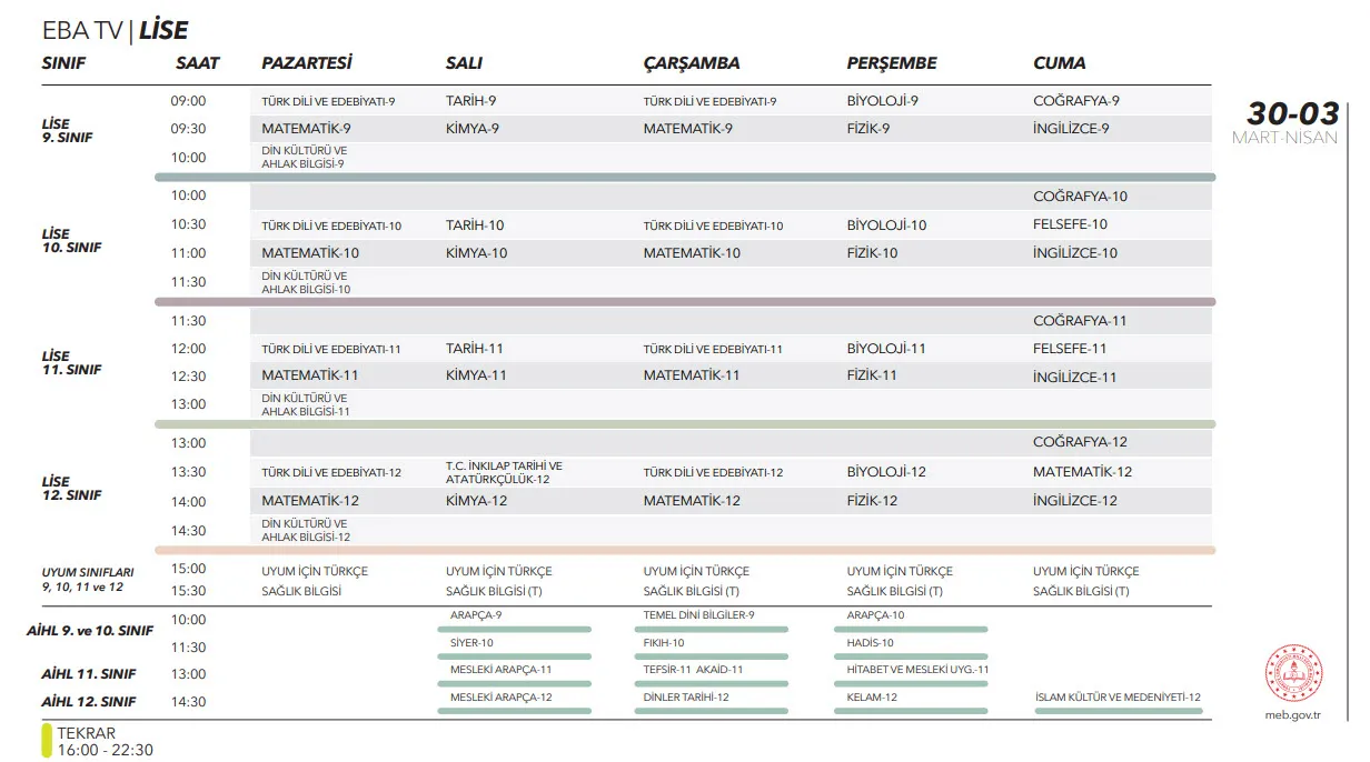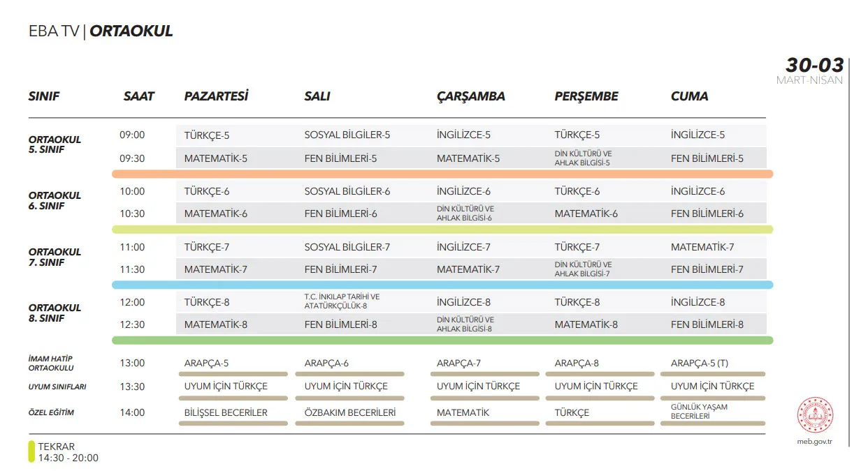 İşte, ders programı, yayın akışı ve uzaktan eğitim canlı izleme ekranı;