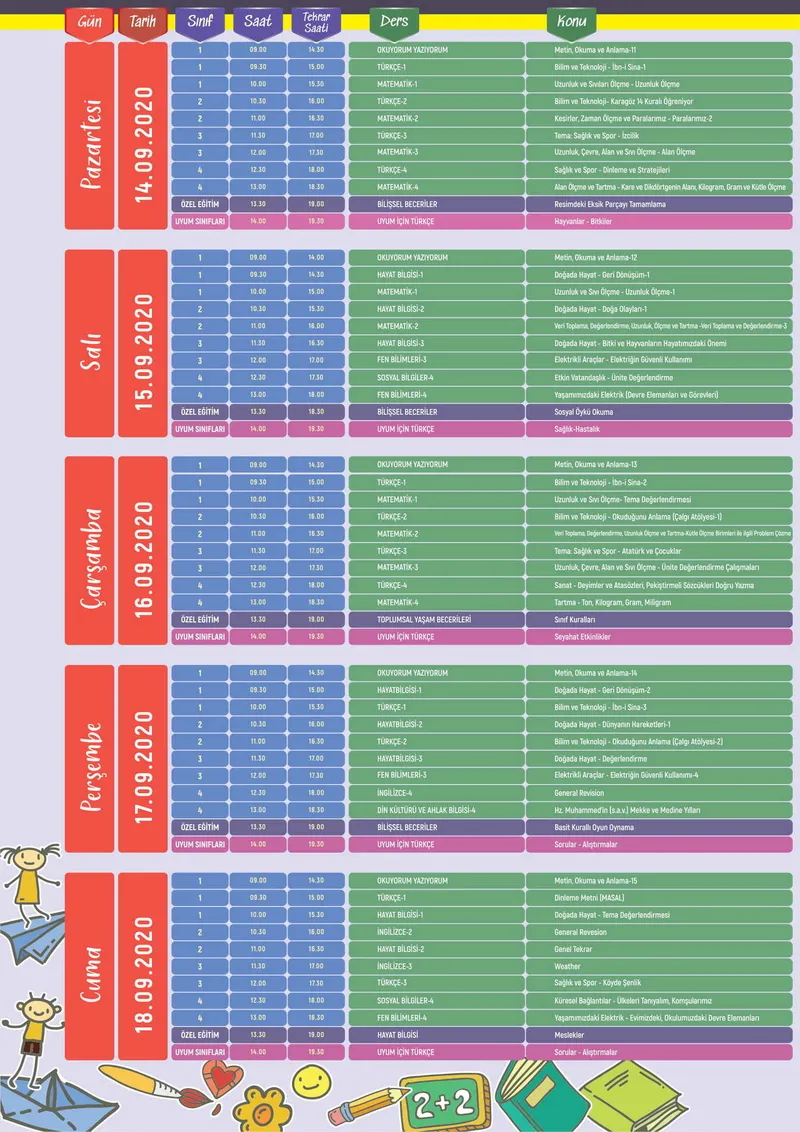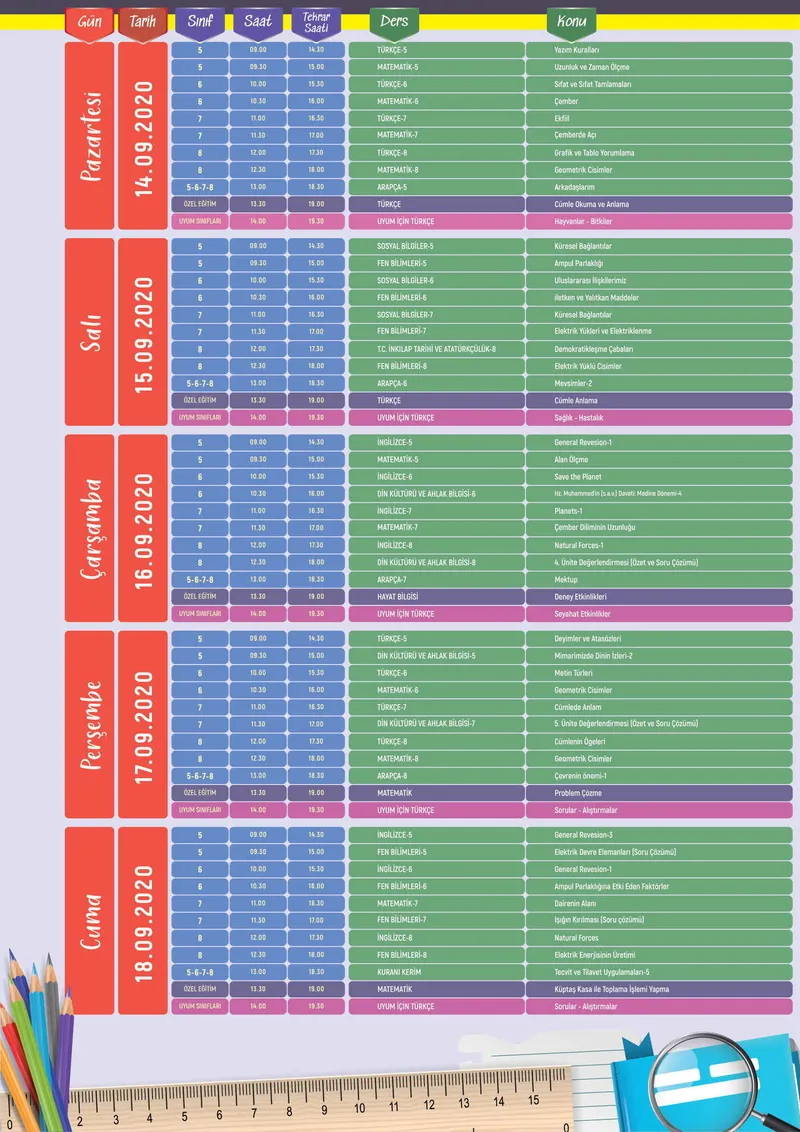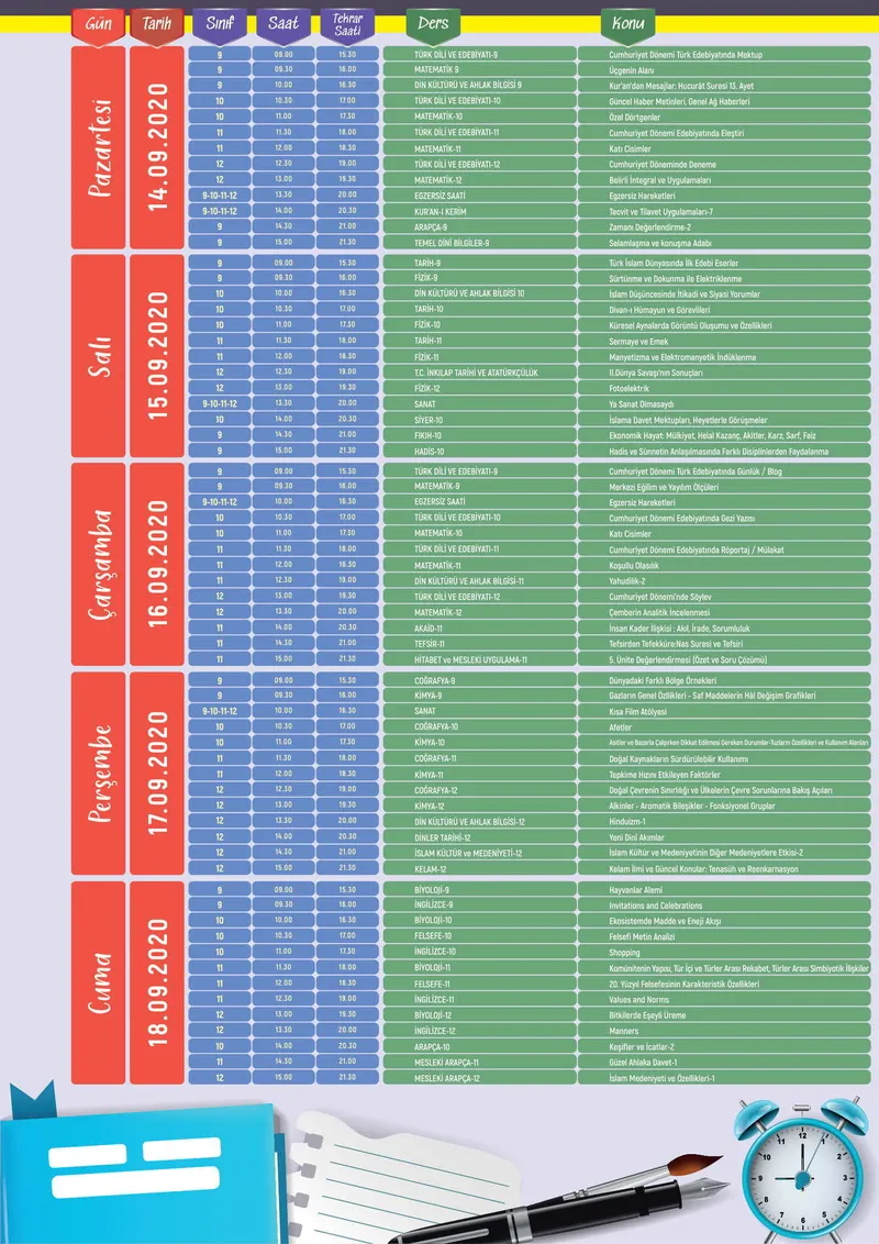 İlköğretim, ortaöğretim ve lise için haftalık ders programı şu şekilde: