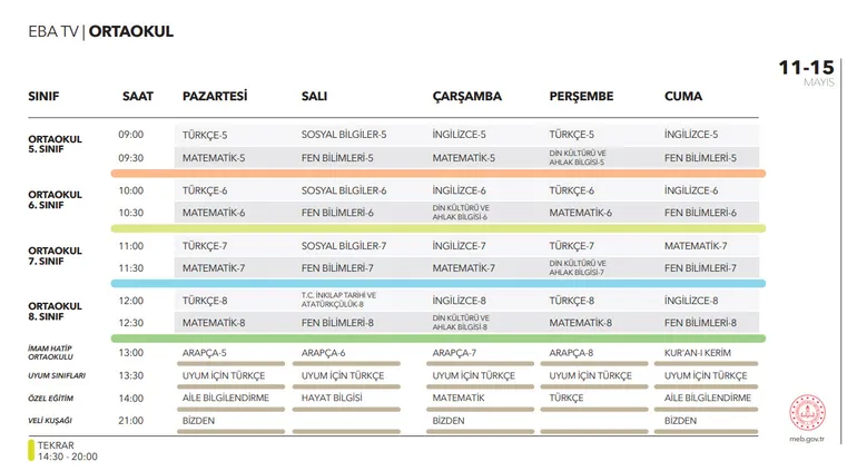 - EBA TV Ortaokul ders tekrar saatleri: 14.30 - 20.00