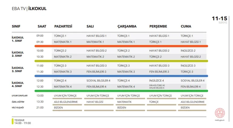 - EBA TV İlkokul ders tekrar saatleri: 14.00 - 19.00