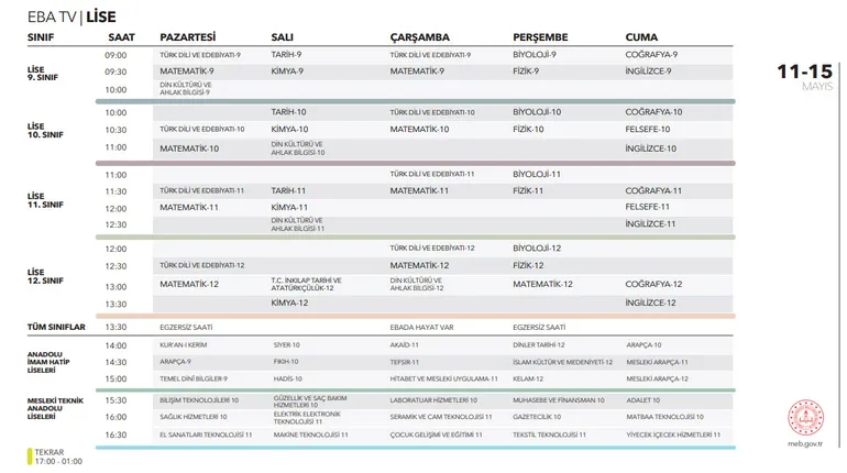 - EBA TV Lise ders tekrar saatleri: 17.00 - 01.00