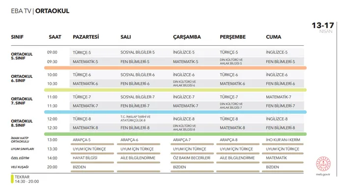 EBA İLKOKUL, ORTAOKUL VE LİSE HAFTALIK DERS PROGRAMI 13 NİSAN - 17 NİSAN