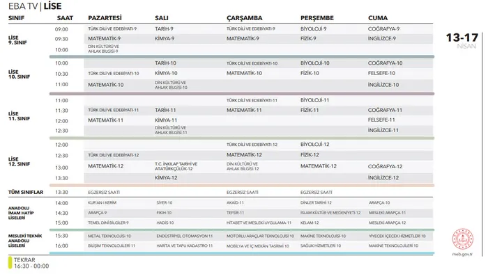 - EBA TV Lise ders tekrar saatleri: 16.30 - 00.00