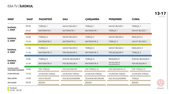 MEB, 13 Nisan ila 17 Nisan için yayımladığı haftalık ders programı ve yayın akışı bilgisi ile ilkokul, ortaokul ve lise EBA TV uzaktan eğitim ders tekrarı saatlerini duyurdu.