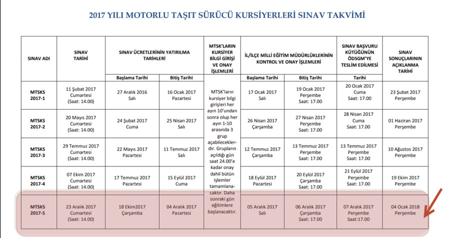 2017 yılı motorlu taşıt sürücü kursiyerleri sınav takvimine göre yeni yılda ehliyet sınav sonuçlarının 12 gün sonra açıklanacağı duyurulmuştu. Buna göre 23 Aralık 2017 Ehliyet sınavının açıklanma tarihi 4 Ocak 2018 Perşembe günüdür.