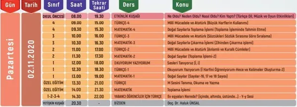 EBA TV İLKOKUL DERS PROGRAMI