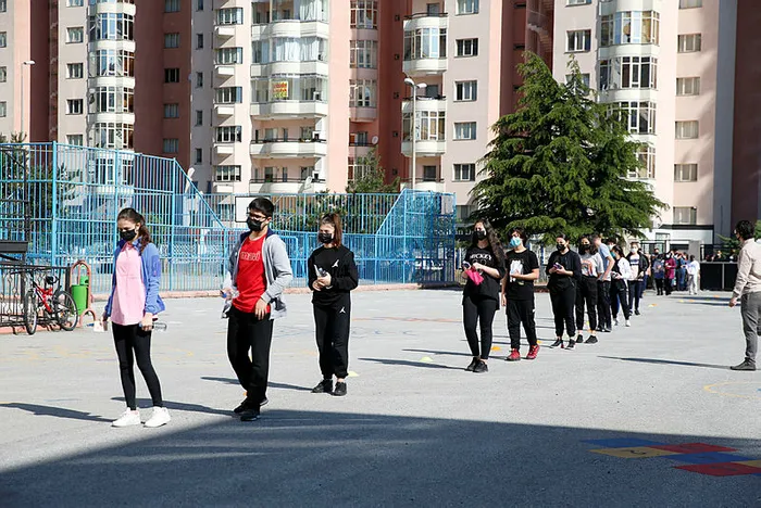 İki sınav oturumu arasındaki 45 dakikalık zaman diliminde Kovid-19 tedbirleri kapsamında okul içinde veya bahçesinde sosyal mesafe kuralına uyulması için tedbirler alındı.