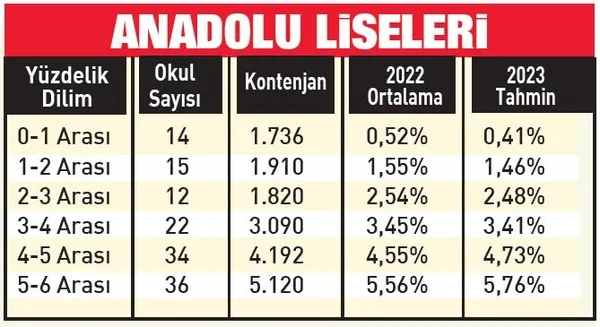 LGS'yle öğrenci alacak Türkiye genelindeki Anadolu liselerinin bu yılki kontenjanı 71 bin 150 oldu. Yüzdelik dilimi 0 ile 1 arasında olan okul sayısı 14. Bu okullar toplam 1736 öğrenci alacak. Tahmini yüzdelik dilimde yığılmadan kaynaklı bir miktar değişim bekleniyor. Geçen yıl yüzde 0,52 dilime kadar yerleşilen okulların bu aralıkta yüzde 0,41 ile dolması bekleniyor. En fazla kontenjan ise yüzdelik dilimi 10 ile 12 arasında liselerde var. Bu aralıkta olan toplam 55 okula 8 bin 570 öğrenci alınacak. Geçen yıl ortalama yüzde 10,97 olan dilimin bu yıl yüzde 11,76 olacağı tahmin ediliyor. Bu yıl ayrıca 4 bin 760 depremzede öğrenci de farklı illerdeki Anadolu liselerine yerleştirilecek.