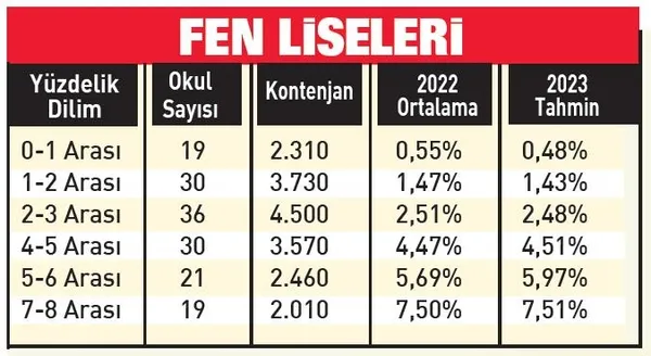 LGS'yle öğrenci alacak Türkiye genelindeki fen liselerinde bu yıl kontenjan 40 bin 320 olarak belirlendi. Yüzdelik dilim 0 ile 1 arasında olan toplam 19 fen lisesi var. Bu dilimdeki fen liseleri 2 bin 310 öğrenci alacak. Geçen yıl yüzde 0,55 yüzdelik dilimin bu yıl yüzde 0,48 olması bekleniyor. En fazla kontenjan ise yüzde 3 ile 4 arasında olan okullarda. Bu dilimdeki toplam 45 lise, 5 bin 430 öğrenci alacak. Geçen yıl ortalama 3,50 olan yüzdelik dilimin bu yıl yüzde 3,56'ya yükselmesi bekleniyor. Bu yıl ayrıca 2 bin 688 depremzede öğrenci de farklı illerdeki fen liselerine ilave kontenjan kapsamında alınacak.