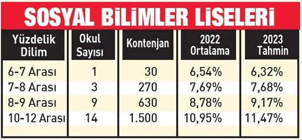 BU yılki kontenjanı 10 bin 740. Bu lise türleri en yüksek yüzde 6-7 aralığında öğrenci alıyor. Bu yüzdelik dilim aralığında toplam 1 okul var. Geçen yıl 6,54 yüzdelik dilimin bu yıl yüzde 6,32 olması bekleniyor. Bu yıl ayrıca 716 depremzede öğrenci farklı illerdeki sosyal bilimler liselerine yerleştirilecek.