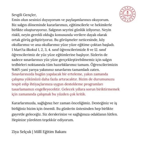 Yazıda, "1 Mart 2021 tarihinden itibaren de mesleki ve teknik Anadolu liseleri, çok programlı Anadolu liseleri, güzel sanatlar liseleri ve spor liseleri derslerine ait uygulama kazanımlarının yüz yüze eğitimlerine tüm sınıf seviyelerinde başlanacaktır." bilgisi paylaşıldı.