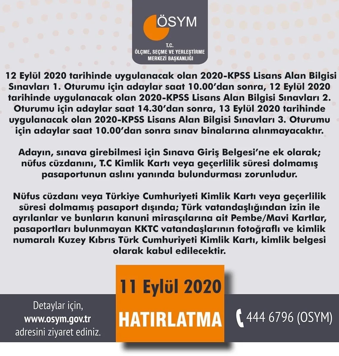 Adaylar, sınava girecekleri yer bilgisini gösteren Sınava Giriş Belgesini, ÖSYM'nin https://ais.osym.gov.tr internet adresinden 10 Eylül 2020 tarihinde saat 14.20'den itibaren T.C. Kimlik numaraları ve aday şifreleri ile edinebileceklerdir.