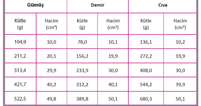 Her maddenin bir özkütlesi vardır. Bazı maddelerin özkütle değerleri;