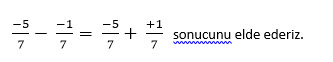 Paydalar eşit olduğundan dolayı payda eşitleme işlemi yapmaya gerek duymuyoruz. Çıkartma işlemini toplamaya dönüştürmeli ve çıkan sayının işaretini değiştirmeliyiz.
