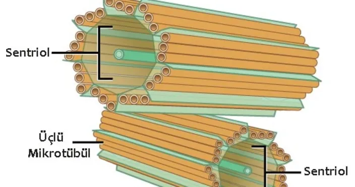 Üç ile beş milimikron uzunluğunda, birbirine dik, er ve ribozom taşımayan, ortası saydam; çevresi her biri 9 mikrotubulus tripletinden oluşmuş iki silindir halinde görülür. Sayıları çoğunluk iki tanedir (Dip-losoma); bazı hücrelerde çok sayıda olabilir. Sentriyoluma, etrafındaki sentroplazma ile birlikte "c e n t r o s o m a" denir. Bölünme başlarken, kutup ipliklerinin (iğ iplikleri) merkezinde bulunduğu için "c e n t r i o l = Sentriyol" adım alır.