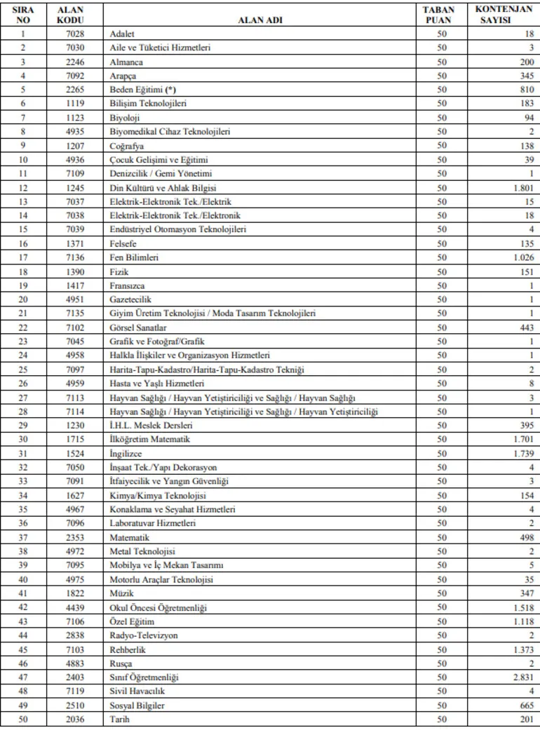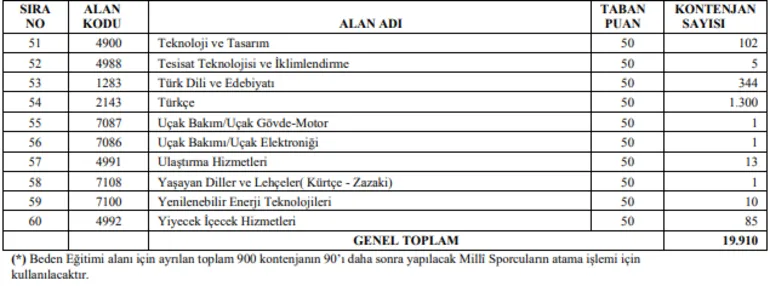 ATAMA YAPILACAK ALANLAR İLE BAŞVURUYA ESAS OLACAK TABAN PUAN VE KONTENJAN LİSTESİ