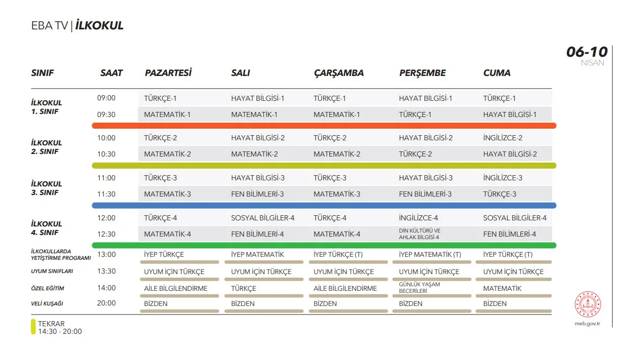 EBA üzerinden yapılacak olan ilkokul eğitiminin ders programı şu şekilde: