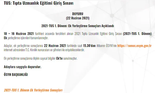 2021-TUS 1.DÖNEM EK YERLEŞTİRME SONUÇLARI AÇIKLANDI!