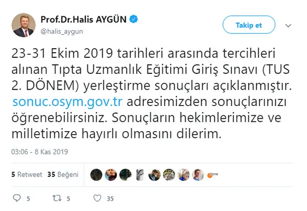 Tıp fakültesi mezunlarının uzmanlık eğitimi almak için katıldığı Tıpta Uzmanlık Eğitimi Giriş Sınavı tercih sonuçları Prof.Dr. Halis Aygün'ün twitter hesabından yaptığı açıklama ile netlik kazandı. Sonuçların bugün öğleden sonra adayların erişimine açılacağı bilgisi verilmişti. Sonuçlar adayların erişimine açıldı.