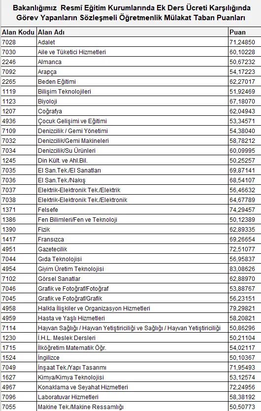 MEB ÜCRETLİ ÖĞRETMENLİK TABAN PUANLARI