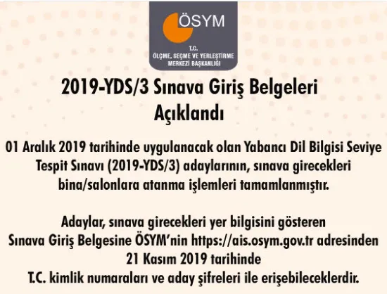 01 Aralık 2019 tarihinde uygulanacak olan Yabancı Dil Bilgisi Seviye Tespit Sınavı (2019-YDS/3) adaylarının, sınava girecekleri bina/salonlara atanma işlemleri tamamlanmıştır. Adaylar, sınava girecekleri yer bilgisini gösteren Sınava Giriş Belgesini ÖSYM'nin https://ais.osym.gov.tr adresinden 21 Kasım 2019 tarihinde saat 14.00'ten itibaren T.C. kimlik numaraları ve aday şifreleri ile edinebileceklerdir.