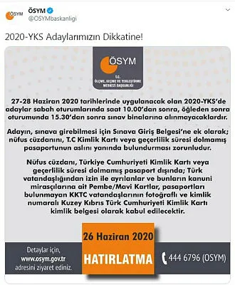 YKS 3. oturumu olan YDT ise, 28 Haziran Pazar 15:45'te başlayacak ve 120 dakika sürecek.
