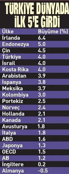 OECD) ve Avrupa Birliği ülkeleri içinde en yüksek oranda büyüyen ikinci, G20'de de üçüncü ülke olmayı başardı. OECD ülkeleri arasında İrlanda, bu yılın ocak-mart döneminde geçen yılın aynı çeyreğine göre yüzde 6.4 büyümeyle ilk sırada yer aldı. Bu ülkeyi yüzde 4 ile Türkiye, İsrail ve Kosta Rika, yüzde 3.8 ile İspanya izledi. OECD ülke ekonomilerinin birinci çeyrekte ortalama büyümesi yüzde 1.5 olarak tahmin edildi. Söz konusu dönemde ekonomik büyüme Avrupa Birliği'nde (AB) yüzde 1.2, Euro Bölgesi'nde yüzde 1.3 oldu. İlk çeyrek büyüme verisi açıklanan G20 ülkeleri içinde de büyüme oranı en yüksek ülke yüzde 5 ile Endonezya oldu. Bu ülkeyi yüzde 4.5 ile Çin, yüzde 4 ile Türkiye, yüzde 3.9 ile Suudi Arabistan takip etti. AB ülkelerinin büyüme oranlarına bakıldığında ise İrlanda'nın ilk sırada yer aldığı görüldü. Bu ülkenin ardından Türkiye'nin ikinci, İspanya'nın üçüncü sırada yer aldığı hesaplandı.