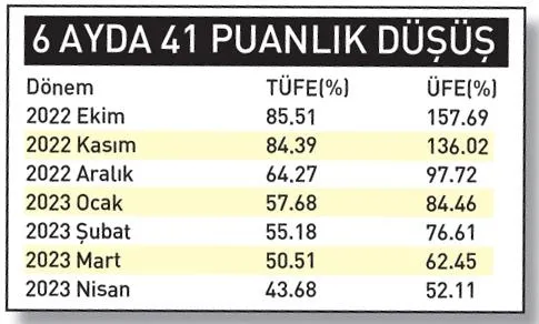 Enflasyonda geçen yılın kasım ayında başlayan düşüş trendi hız kesmeden devam ediyor. Türkiye İstatistik Kurumu (TÜİK) tarafından açıklanan verilere göre, Tüketici Fiyatları Endeksi (TÜFE) nisanda yüzde 2.39 ile 2.65 olan piyasa beklentisinin altında arttı. Martta yüzde 50.51 olan yıllık enflasyon nisanda yüzde 43.68 ile son 16 ayın en düşük seviyesine geriledi. Yıllık enflasyon art arda 6 ay düşüş sergilerken, bu dönemde yaşanan gerileme 41 puana ulaştı. Öte yandan yılın ilk 4 ayındaki enflasyon ise yüzde 15.21 olarak gerçekleşti.