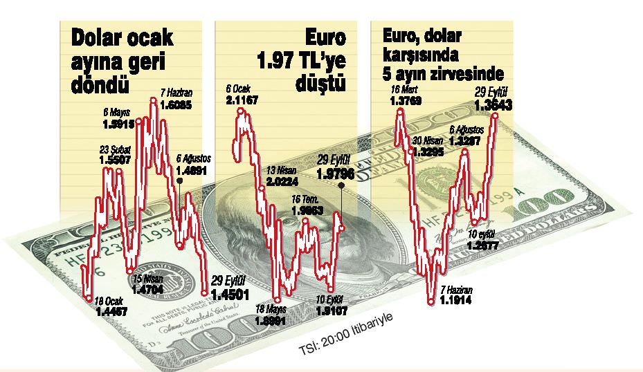 İhracatçı, rekabet gücünü elinden alan düşük kur sorunundan yakınırken dolar bir türlü fren tutmuyor. ABD ekonomisine yönelik birbiri ardına gelen kötü haberler ve Obama yönetiminin sıkıntılı ekonomiyi canlandırmak adına piyasaya daha fazla para süreceği yönündeki söylentiler, ülkedeki ekonomik iyileşmenin zayıfladığıyla ilgili endişeleri artırarak euronun dolar karşısında son 5 ayın en yüksek seviyesine çıkmasına neden oldu. Avrupa Birliği'nin ortak para birimi euro dolar karşısında son 5 ayın en yüksek seviyesi olan 1.36'ya çıkarken; dolar içeride de pariteden bağımsız olarak düşmeye başladı. Euro karşısında gün içindebir miktar toparlanan dolar TL karşısında değer yitirmeyi sürdürdü. Dolar saat 20:00 itibariyle dün 1.45 TL ile yılın en düşük seviyesine indi. Gün içinde 1.97 TL'yi test eden euro tekrar yükselişe geçerek 1.9796'ya çıktı. Euro, Avrupa'da sabahki işlemlerde 1.3623'ü gördükten sonra, 1.3614'e geriledi. Ancak akşam saatlerinde yeniden 1.3643'e kadar yükseldi.