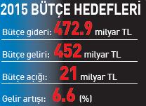 Türkiye'nin ikinci çeyrekte yüzde 2.1'e gerileyen büyüme hızına Maliye Bakanı Mehmet Şimşek geç de olsa tepki gösterdi. Yüzde 3-4'lük büyümenin Türkiye için kabul edilemez olduğunu söyleyen Şimşek, "Tekrar yüksek büyüme patikasına girmemiz gerek. Bunun için de mikro düzeyde reformlar yapmalıyız" dedi. Dün 9 aylık gerçekleşmeleri ve 2015 bütçesiyle ilgili basın toplantısı düzenleyen Bakan Şimşek, yeni bir vergi artışı öngörmediklerini, lüks tüketime vergi konusunda bir çalışma yapmadıklarını da açıkladı. Kamunun lüks yerlerden çekileceğini belirten Şimşek, memur-emekliyi enflasyon altında ezdirmeyecekleri mesajını da verdi. Şimşek, Türkiye'nin 2015 yılı bütçe giderlerinin 472.9 milyar, bütçe gelirlerinin 452 milyar, bütçe açığının ise 21 milyar TL olarak öngörüldüğünü bildirdi. Bakanın açıklamaları şöyle: