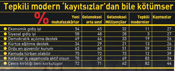 Evet onlar her şeye tepkili değiller. Ağırlıklı olarak Marmara bölgesinde yaşıyorlar. 'Tepkili modernler' ve 'kayıtsızlar' kadar olmasa da ekonomik ve siyasal gidişten memnun değiller. Kamuda başörtüsünü güçlü şekilde destekliyorlar. Ama Kürtçe eğitime, demokratik açılıma, HES ve nükleere karşılar. Kadının iş hayatına katılmasını da destekliyorlar.