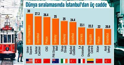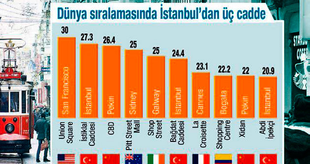 Gayrimenkul firması Cushman& Wakefield'in 65 ülkenin 330 caddesindeki perakende kira rakamlarını incelediği araştırmaya göre İstiklal, Bağdat ve Abdi İpekçi dünyanın en pahalı caddeleri arasında ilk 10'a girdi. 2013'ün sonundan 2014'ün eylül ayına kadar geçen 12 aylık sürede perakende kiralarının global olarak yüzde 2.4 arttığının belirtildiği araştırmada, kira rakamları en hızlı yükselen cadde ise İstiklal Caddesi oldu. Araştırmanın 'en pahalı perakende lokasyonları' sıralamasında ise Türkiye geçen yıla göre 9 sıra yükselerek 20'nciliğe yerleşti. Dünyada kiraların en hızlı yükselen caddesi ise yüzde 30 artışla San Francisco'da yer alan Union Square oldu. Burayı yüzde 27.3 artışla İstiklal Caddesi takip etti. Sıralamada Bağdat Caddesi yüzde 24.4 artışla altıncı, Abdi İpekçi ise yüzde 20.9 yükselişle 10'uncu sırada yer aldı. Dünyanın en pahalı alışveriş caddesi ise metrekaresi 29 bin 822 dolar ile New York 5. Cadde oldu. New York'u 23 bin 307 dolar ile Hong Kong Causeway Bay izledi. Paris Champs-Elysees ise geçen yılki yerini korudu ve 13 bin 255 dolarla üçüncü sırada yer aldı.
