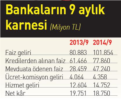 maliyetlerindeki artışın etkisiyle marjları daralan bankalar, buna rağmen kârlılığı korumayı bildi. Sektörün kârı geçen yılın 9 aylık dönemine göre yüzde 5.3 azalarak 18 milyar 750 milyon TL olarak gerçekleşti. Bankaların günlük ortalama net kârı 68.7 milyon TL oldu. Sektör, yılın ilk yarısında yüzde 10'un üzerinde olan kâr düşüşünü 5'e kadar indirdi. Bankalar yılın ilk çeyreğinde 5.8 milyar, ikinci çeyrekte 6.5 milyar, üçüncü çeyrekte ise 6.4 milyar lira kâr etti.