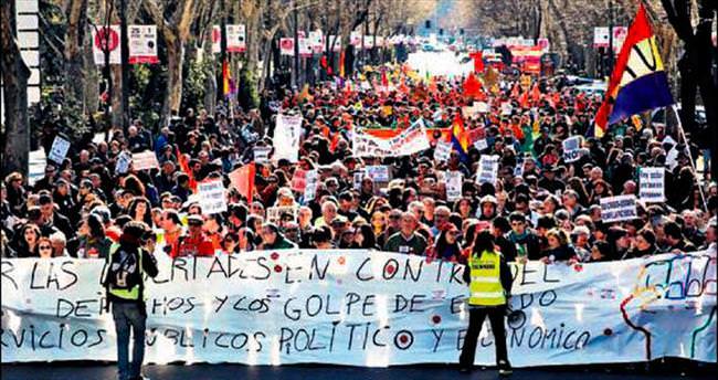 bazı sivil toplum örgütlerinin çağrısıyla ekonomik krizde çıkartılan yeni yasaları protesto etmek için başkent Madrid'de gösteri düzenlendi. İspanyol meclisinde 23 Şubat 1981 tarihinde başarısızlıkla sonuçlanan askeri darbe girişiminin yıl dönümüne atfen Madrid'de organize edilen gösteride iktidardaki sağ görüşlü Halk Partisi (PP) de protesto edildi.