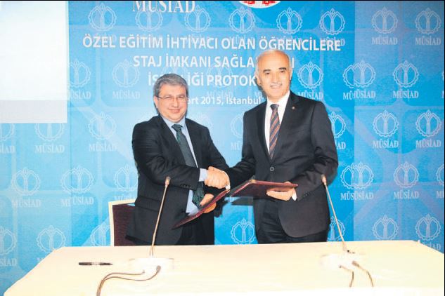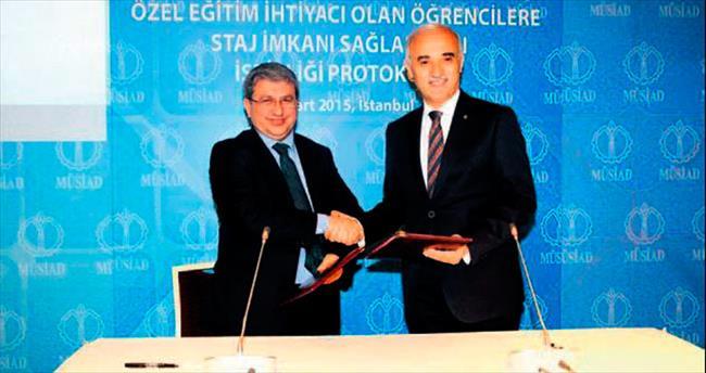 Müstakil Sanayici ve İşadamları Derneği (MÜSİAD) Milli Eğitim Bakanlığı'yla (MEB) özel eğitime ihtiyacı olan öğrencilere staj imkânı sağlanmasına yönelik işbirliği protokolü imzaladı. MÜSİAD Genel Başkanı Nail Olpak, işadamlarının bilançolarla hareket ettiğini ama hayatın sosyal yönlerinde de olmaları gerektiğini belirterek, topluma katkı sağlayacak bir projeye imza attıklarını söyledi. Olpak, "Genel merkez olarak yapmamız gereken, adıyla sembolik bir değer taşıyan bu protokolü sadece genel merkezlerimizde değil, farklı yerlerdeki şubelerimizde de sağlamak, sadece kağıt üzerinde kalan iki imza olarak bırakmamaktır" diye konuştu. MEB Özel Eğitim ve Rehberlik Hizmetleri Genel Müdürü Celil Güngör ise öğrencilerin her yıl staj problemlerinin olduğunu aktararak, protokoldeki amacın öğrencilerin yaptığı ürünlerin işgücü piyasasında kabul görmesini sağlamak olduğunu söyledi. Protokol kapsamında MEB, İl Milli Eğitim Müdürlükleri aracılığıyla Özel Eğitim Mesleki Eğitim Merkezleri ile Özel Eğitim Meslek Liseleri'nde eğitim gören öğrencilerden staj yapacak olanları belirleyerek MÜSİAD'a iletecek. MÜSİAD ise bu öğrencilere uygun staj imkânlarının sağlanması için gerekli çalışmaları yürütecek.