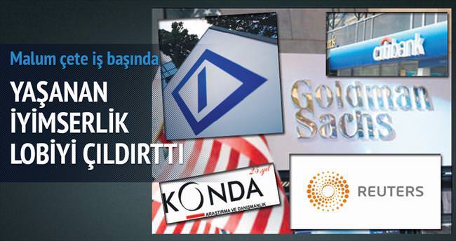 Piyasaların AK Parti'nin tek başına iktidarını devam ettireceği beklentisiyle bahar havasına girmesi lobiyi çılgına çevirdi. Lobi, uluslararası finans kuruluşları ve içerideki medya uzantılarıyla seçim öncesinde algıyı bozmak için harekete geçti. Türkiye'de kaos ortamı yaratmaya yönelik algı operasyonlarında başı çeken İngiliz haber ajansı Reuters, Konda'nın anketini "Türkiye'de koalisyon ihtimali artıyor" başlığıyla servis etti. Türkiye'nin iyi gittiği her dönemde olumsuz raporlarla suyun akışını değiştirmek için elinden geleni yapan yatırım bankaları, zamanlaması manidar bir biçimde, aynı ayda üç rapor yayınladı. Raporlarla yabancı yatırımcının algısı bozulmaya çalışıldı. İngiliz haber ajansı Reuters da "Piyasada pozitif ayrışma tersine döndü" haberleriyle adeta değirmene su taşıyor.