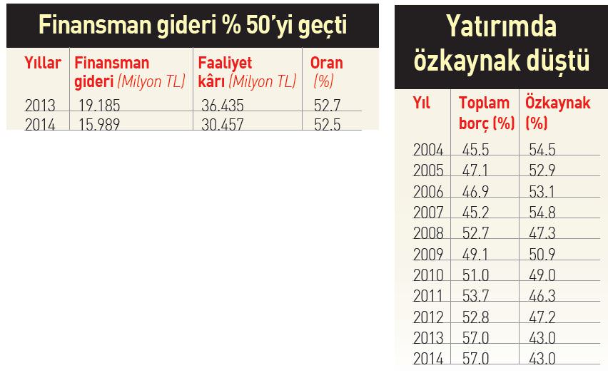 Borçluluğu artarken faaliyet kârının yarısından fazlasını finansman giderlerine harcayan Türkiye'nin en büyük sanayi şirketleri 'kaynak' sıkıntısı çekiyor. 2004'te yüzde 54.5 olan yatırımlardaki özkaynak kullanım oranı, 2014'te yüzde 43'e düşünce tehlike sinyalleri çaldı. Katma değer yaratan şirketlerin İSO 500'deki ağırlığı da buna paralel olarak azaldı. 2004'te İSO 500'de 7 elektronik şirketi varken 2014'te bu sayı 3'e geriledi. Bunda şirketlerin rekabet gücünün zayıflaması etken oldu. Bu sorun İstanbul Sanayi Odası (İSO) Meclisi'nin haziran ayı olağan toplantısına da damga vurdu. "İSO 500 Aynasından Ekonomi ile Sanayimizdeki Ana Sorunlar ve Çözüm Yolları" gündemiyle yapılan toplantıda İSO Yönetim Kurulu Başkanı Erdal Bahçıvan, "Türkiye sanayisinin hantal boyutundan, ileri teknoloji kullanan ve Ar-Ge altyapısını güçlendiren bir yapıya dönüştürülmesi gerekiyor" dedi.