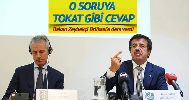 Ekonomi Bakanı Nihat Zeybekci, Brüksel'de FETÖ gözaltıları ile ilgili soruları yanıtlarken, ByLock'lu iletişimi örnek vererek, "Siz olsaydınız ne yapardınız" diyerek adeta ders verdi. Zeybekci, Avrupa Politika Çalışmaları Merkezi (CEPS) adlı düşünce kuruluşu tarafından düzenlenen "Türkiye'deki Siyasi, Ekonomik Gelişmeler ve Gümrük Birliği'nin Geleceği" konulu konferansta bir konuşma yaptı.