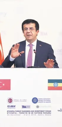 i, Etiyopya'nın Başkenti Addis Ababa'da düzenlenen Türkiye-Etiyopya İş Forumu'na katıldı. Etiyopya Sanayi Bakanı Ahmed Abtew ile Etiyopya Dışişleri Bakanı Worknehe Gebeyehu'nun da katıldığı forumda konuşan Zeybekci, "Afrika açılımı ile ticareti 5 milyar dolardan 20 milyar dolara çıkardık. 100 milyonluk Etiyopya'da elektrik üretiminin 10 katına çıkması gerekiyor. Bu da çok yatırım ve fırsat demek" dedi