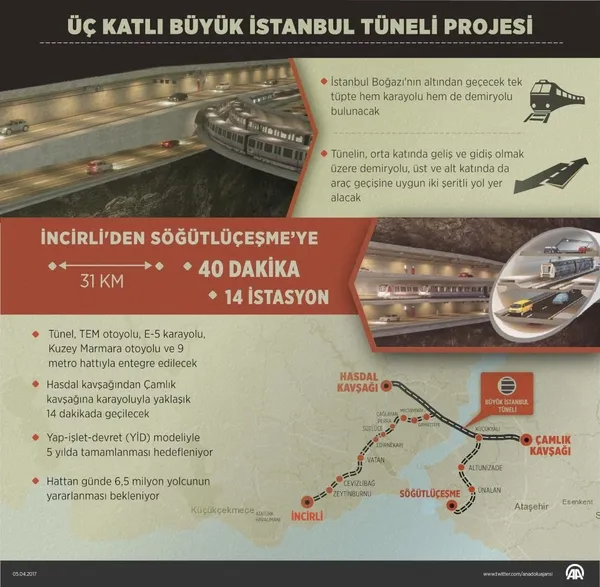"İncirli'den yer altına girecek raylı sistem, Mecidiyeköy'den, Zincirlikuyu'dan denizin altından geçecek, Söğütlüçeşme'den girip Kadıköy-Kartal'a, Marmaray'a bağlanmış olacak. Avrupa yakasında Hasdal'dan yer altına girecek tünel, aynı şekilde bu tünelle birleşecek, Anadolu yakasına geçtikten sonra da Çamlık'tan çıkarak TEM'e bağlanacak. Bu, karayolu taşımacılığında otomobiller için önemli bir avantaj olacak, raylı sistem anlamında çok daha önemli bir avantaj. Marmaray, Halkalı'dan Gebze'ye kadar bütün raylı sistemlerle entegre olarak gidiyor. Bu da onun bir benzeri olarak İncirli'den Sögütlüçeşme'ye kadar birçok raylı sistemle entegre olacak, günde 6,5 milyon yolcunun taşındığı raylı sistemleri entegre edecek. İnsanların kapısından çıktığı zaman bir başka hatta aktarma yaparak, raylı sistemle seyahatini devam ettirmesi anlamına geliyor. Çok önemli bir proje ve önemli mesafe katettik. Önümüzdeki yıl ihalesini gerçekleştirip, yapım süreçlerini başlatmış olacağız."