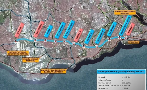 Hattın metro istasyonları da belli oldu. Buna göre; Yenikapı, Kocamustafapaşa, Silivrikapı, Zeytinburnu, Osmaniye, İncirli, Adnan Kahveci, Siyavuşpaşa, Zafer Çobançeşme, Sefaköy istasyonları hatta yer alacak.
