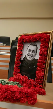 Merhum Çağlar'ın mecliste oturduğu masaya kırmızı karanfillerle kaplı fotoğrafı konuldu.