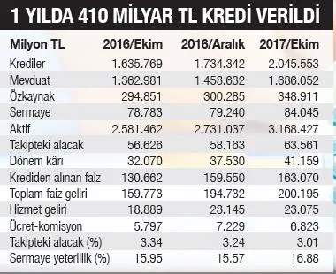 Kredi Garanti Fonu, 365 bin firmaya 220 milyar liralık kredi kullandırarak dünya rekoruna imza atarken, Türk bankaları da son bir yılda kredi artış hızında dünya lideri oldu. Bankacılık Düzenleme ve Denetleme Kurumu'nun verilerine göre, 2016 yılı Ekim sonunda 1 trilyon 635 milyar lira olan kredi hacmi, 2017'nin aynı döneminde yüzde 25 artarak 2 trilyon 45 milyar liraya çıktı. Bankaların kredi hacminde 1 yılda 410 milyar lira civarında bir artış sağlandı. Bu dönemde mevduatlar yüzde 23.7 artarak 1 trilyon 686 milyar liraya, özkaynaklar da yüzde 18 artarak 348.9 milyara çıktı. Bu dönemde net kâr ise yüzde 28'lik büyümeyle 41.1 milyar lirayı aştı. Bankacılık sektöründe geçen yılın ekim ayında yüzde 3.3'ün üstünde olan tahsili gecikmiş alacakların oranı, bu yılın aynı döneminde yüzde 3'e inerken, sermaye yeterlilik rasyosu yüzde 15.9'dan, 16.8'e çıktı.