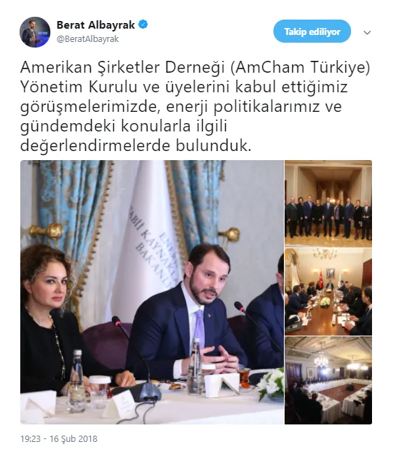 "Amerikan Şirketler Derneği (AmCham Türkiye) Yönetim Kurulu ve üyelerini kabul ettiğimiz görüşmelerimizde, enerji politikalarımız ve gündemdeki konularla ilgili değerlendirmelerde bulunduk." ifadelerine yer verdi.